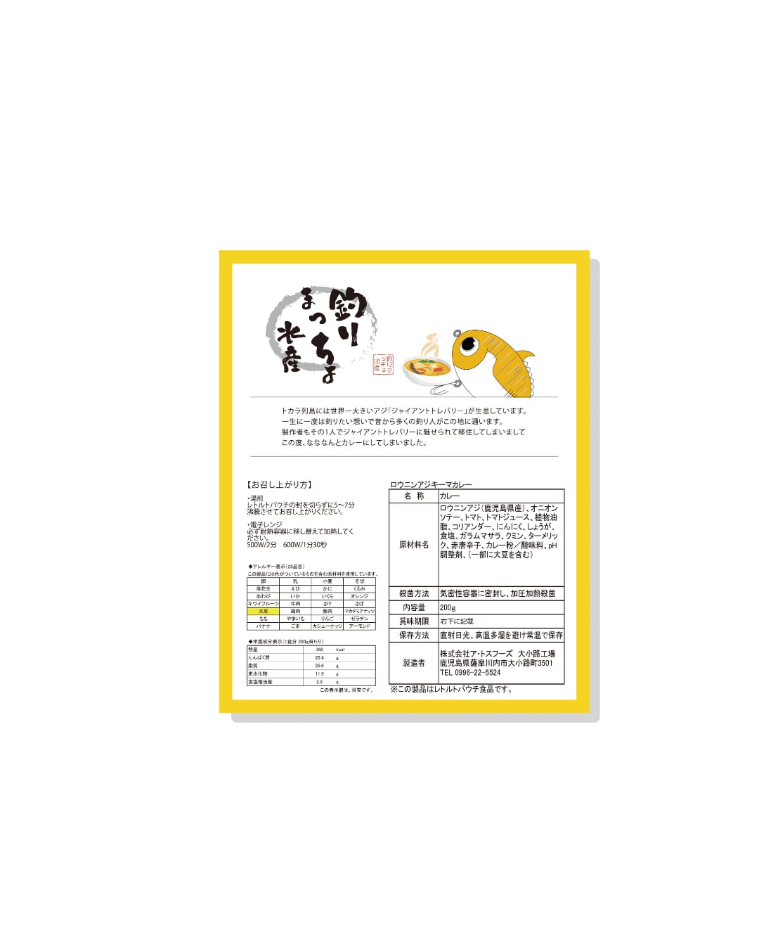 ロウニンアジ、オニオンソテー、トマト、トマトジュース、植物油脂、コリアンダー、にんにく、しょうが、食塩、ガラムマサラ、クミン、ターメリック、赤唐辛子、カレー粉、/酸味料、PH調整剤)